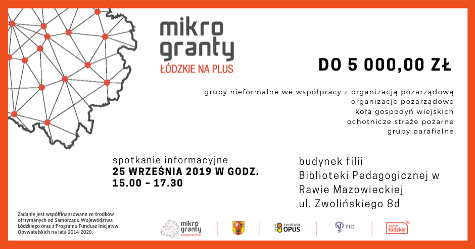 Centrum Promocji i Rozwoju Inicjatyw Obywatelskich OPUS we współpracy z Powiatem Rawskim zaprasza na spotkanie informacyjne dotyczące programu Mikrogranty „Łódzkie na Plus” 2019.