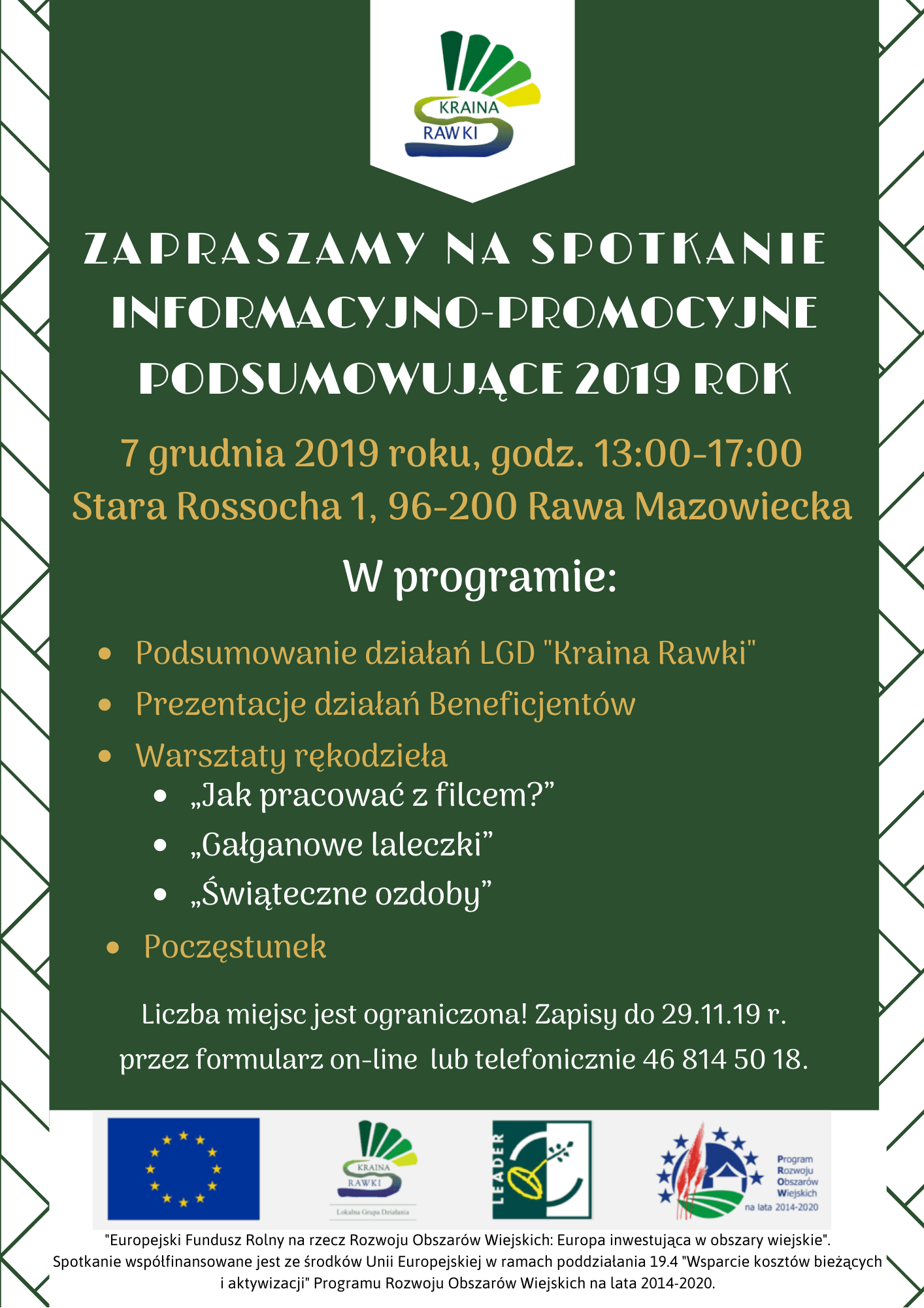 Spotkanie odbędzie się 7 grudnia 2019 roku, godz. 13:00-17:00 w siedzibie LGD „Kraina Rawki: Stara Rossocha 1, 96-200 Rawa Mazowiecka.